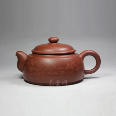 大福君,壶身饱满,上敛下丰,肩部平缓,流采用二弯流明接,平口嘴,压盖设计,整体壶型敦厚平实,流把钮搭配恰当,无一丝唐突,壶身刻绘山清水秀,和壶搭配起来,就是幅完整的画。