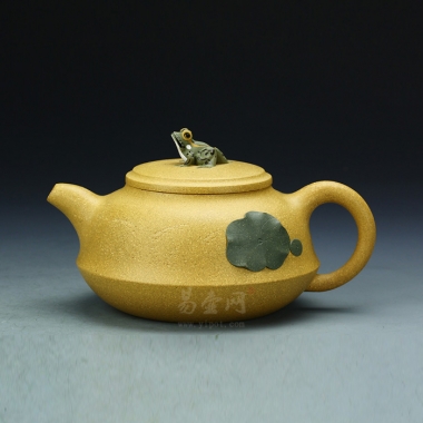 此壶,造型简洁,创意新颖出奇。纵观此壶,仿若一荷塘清新映入眼帘,清风徐徐,荷香阵阵,蛙鸣声声,好一番热闹非凡的景致。壶钮新颖别致,一青蛙圆瞪双眼,眉眼传神,栩栩如生。壶嘴弯流小巧,形象自然。端把环生壶身之上,与壶嘴形成良好的呼应。在壶身处填出荷叶更显浓浓意境。该壶,极具实用和欣赏价值,不可错过。