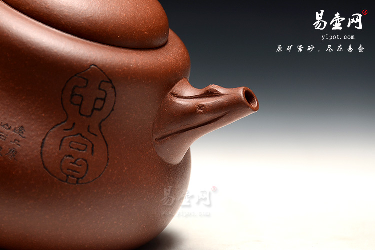 此款壶命名为“福禄”(葫芦),可谓是名副其实。从壶的外形来看,壶身和壶盖共同勾勒出了葫芦的形状,形象逼真,可见制壶者的技艺之精。尤其是壶钮、壶把和壶嘴的设计,精巧别致,,精致可爱。造型是经典的曼生葫芦状,壶身正面镌刻有“葫芦飞鸟图”。反面铭文“心赏”,小字铭记“远上寒山石径斜,白云生处有人家。停车坐爱枫林晚,霜叶红于二月花”如此,足见制壶者的构思之巧妙,创意之新颖独特。